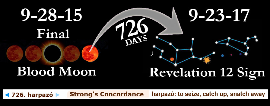 Gerekend vanaf de laatste bloedmaan van de laatste tetrad, dit is 28 september 2015, tot de datum van het Openbaring 12 teken op 23 september 2017 zullen er 726 dagen zijn verstreken. De grondtekst van de Bijbel is genummerd door middel van strongnummers. Het strongnummer van het woord “Harpazo” (Grieks voor opname) is 726.