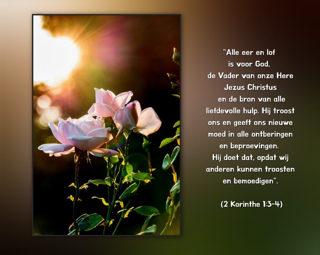 Wat prijzen we onszelf gelukkig! Dwars door ons aardse leven heen ervaren we dat we er niet alleen voor staan. God is een Anker in de storm, geeft balsem voor onze ziel en is een Trooster voor wie verdriet heeft. Omdat Hij erbij is, is jouw pijn, verdriet of lijden niet zinloos. Absoluut niet! Als lijden een doel heeft, dan lijdt jij inderdaad nog steeds, maar wel onder Gods beschermende leiding. En dat te weten, te ervaren, kan zoveel troost geven. Hij is erbij!