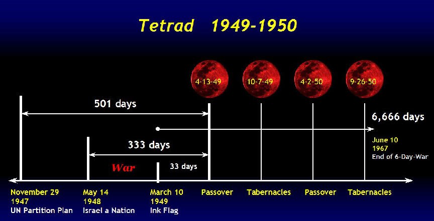 Echter, zijn tekens er niet om een komende gebeurtenis te laten zien en niet pas volgend op de gebeurtenissen? Dit is een probleem geweest met het accepteren van de hele tetradtheorie. Niet alleen dat de verduisteringen er niet mee samenvallen, maar de verduisteringen van 1949-1950 kwamen zelfs na de gebeurtenissen. Voordat het viertal zelfs maar begon, bereikte Israël zijn onafhankelijkheid en werd de oorlog gewonnen. Maar misschien is er hier iets meer dan het oog ziet? En meestal is dat er ook.