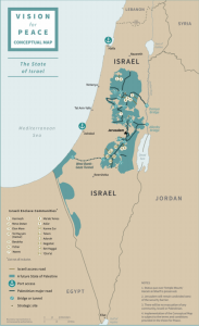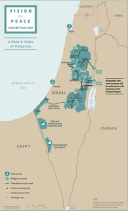 Het is en het blijft een twee-staten oplossing. Het wordt niet één grote verdeling van twee stukken land, maar de Palestijnse Staat zal versnipperd zijn over verschillende gebieden van het Beloofde Land. Er is wel duidelijkheid over de grenzen van Israël en de Palestijnse Staat. Op de foto’s hieronder staat de verdeling van het Beloofde Land (klik om te vergroten!).