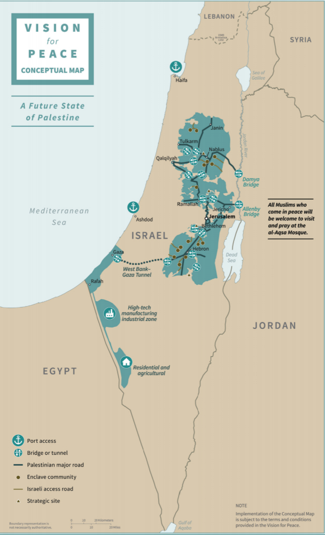 Er is verwarring over dat Jeruzalem de onverdeelde hoofdstad van Israël is en tegelijkertijd lezen we dat de hoofdstad van de Palestijnse Staat Oost-Jeruzalem zal zijn. Hoe zit dit precies? In het plan valt te lezen, dat de grenzen van vandaag de dag van Jeruzalem, met aan de oostkant een veiligheidsbarrière, zullen blijven bestaan. Ten oosten van deze veiligheidsbarrière zijn nu ook de Arabische buurten en dat zal ook blijven bestaan. Deze buurten, Kafr Aqab, Shuafat en Abu Dis, zullen tezamen Oost-Jeruzalem gaan vormen en als hoofdstad van de Palestijnse Staat gaan fungeren.
